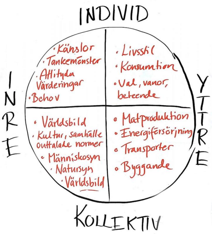 När vi pratar hållbarhet fokuserar vi ofta på de yttre förändringarna vi behöver göra. Dels på individnivå, som att ändra våra vanor, beteenden och vår livsstil... Dels på samhällsnivå, där vi behöver förändra vårt sätt att bygga och bo, producera och distribuera mat, transportera oss och ordna samhällets energiförsörjning…